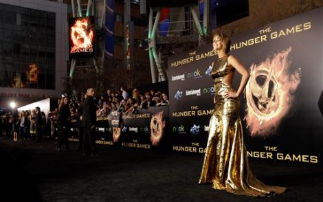 In a Monday, March 12, 2012 file photo, cast member Jennifer Lawrence arrives at the world premiere of “The Hunger Games” in Los Angeles. “The Hunger Games” on Monday, April 30, 2012 was nominated for eight MTV Movie awards, including bids for best cast, breakthrough performance, and movie of the year. (Photo credit: AP photo by Matt Sayles, File)