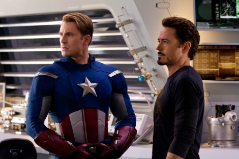 Chris Evans, portraying Captain America, left, and Robert Downey Jr., portraying Tony Stark, are shown in a scene from Marvel’s “The Avengers” (Photo credit: AP photo by Disney, Zade Rosethal)