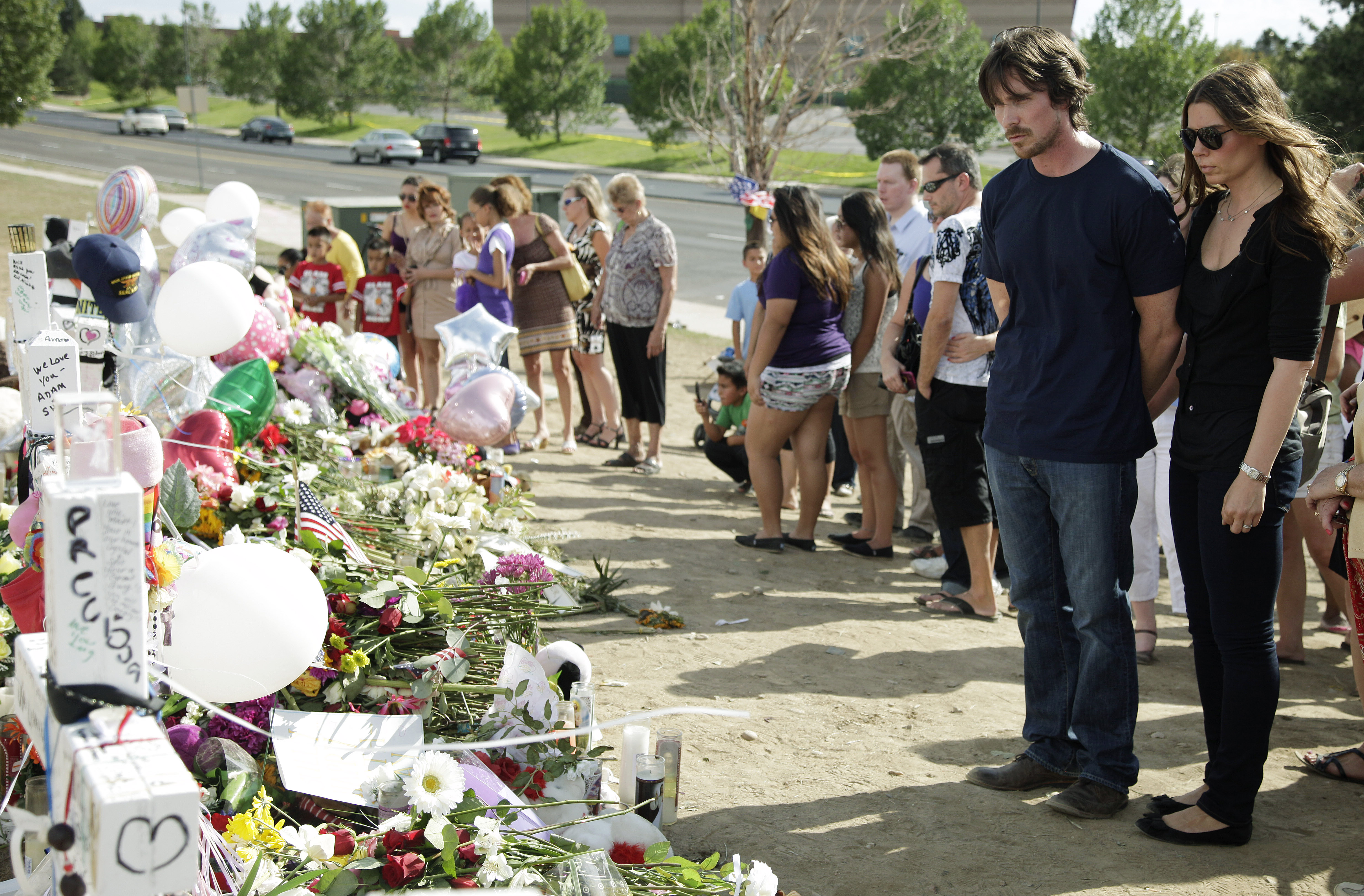 Actor Christian Bale and his wife Sibi Blazic visit a memorial to the victims of Friday’s mass shooting, Tuesday, July 24, 2012, in Aurora, Colo. Twelve people were killed when a gunman opened fire during a late-night showing of the movie “The Dark Knight Rises,” which stars Bale as Batman. (Photo credit: AP photo by Ted S. Warren)