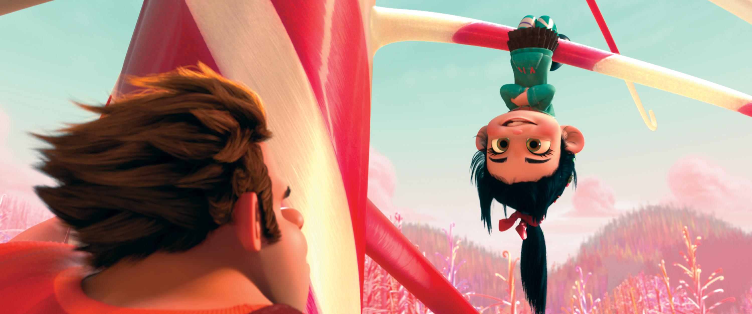 His first attempt lands him in a first-person shooter similar to “Dead Space.” a violet clash between gun-laden soldiers and some nasty insects, where he encounters a tough-as-nails commander, Calhoun (appropriately voiced by Jane Lynch), who later serves as a love interest for Felix and a surprising nod to the role of women in what’s otherwise a boys’ club. This then segues us into the world of Sugar Rush (think “Mario Kart” suffering from a sugar high), a car-racing game so unbelievably saccharin you may comatose. But please don’t until you’ve met the little hellion that is Vanellope von Schweetz (channeling the hilarious Sarah Silverman). A brat with a sharp tongue, Vanellope serves as Ralph’s obvious sidekick. The setback? She’s a “glitch”: as in a glitchy program. Her disability causes her to be ostracized by her fellow racers and the land’s king.