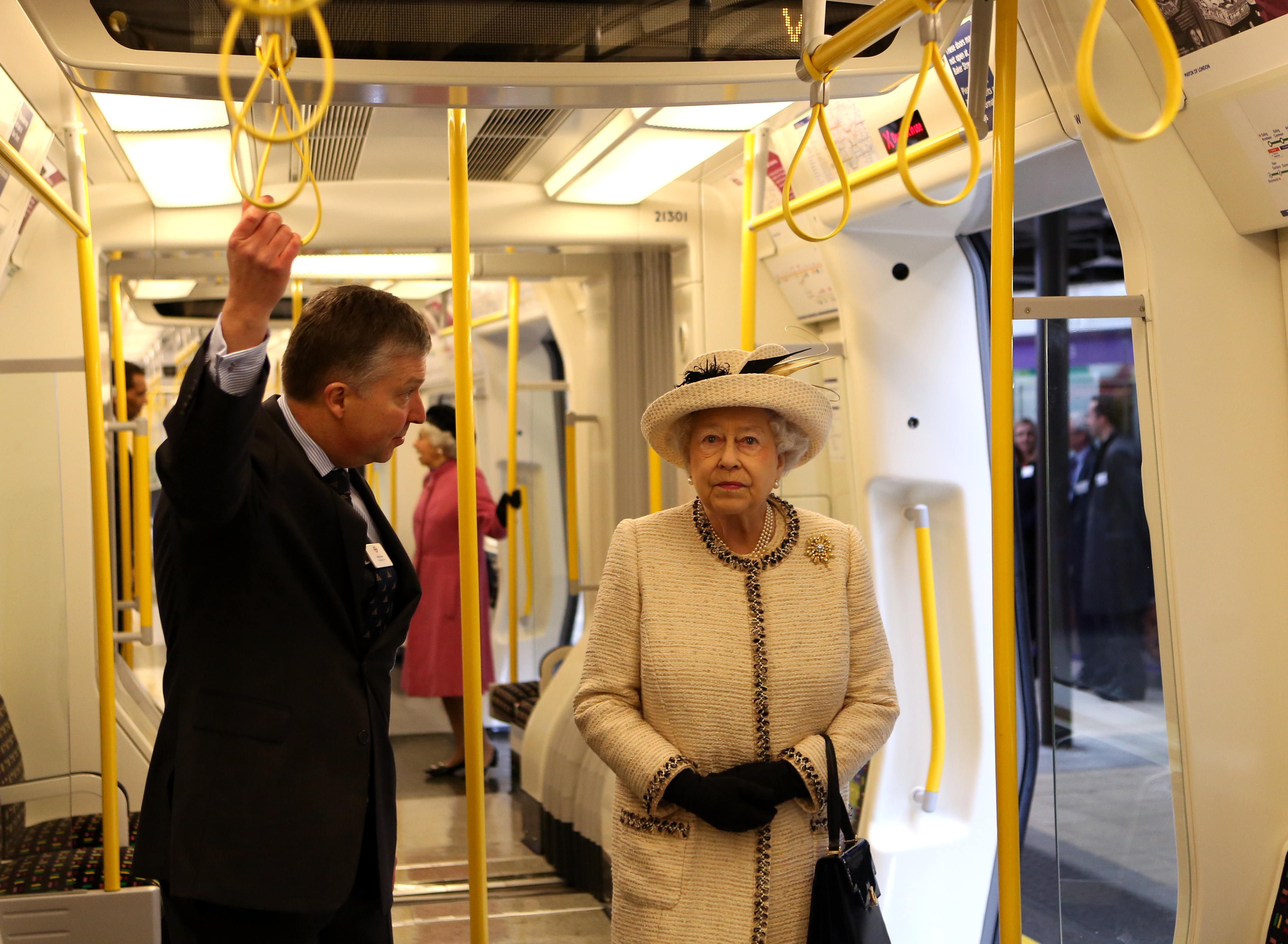 Britain’s Queen Elizabeth II is shown round the carriage of a parked train at Baker Street underground station in London, for a visit to mark the 150th anniversary of the London Underground, Wednesday, March 20, 2013. (Photo credit: AP photo by Chris Radburn, Pool)