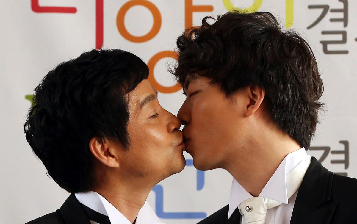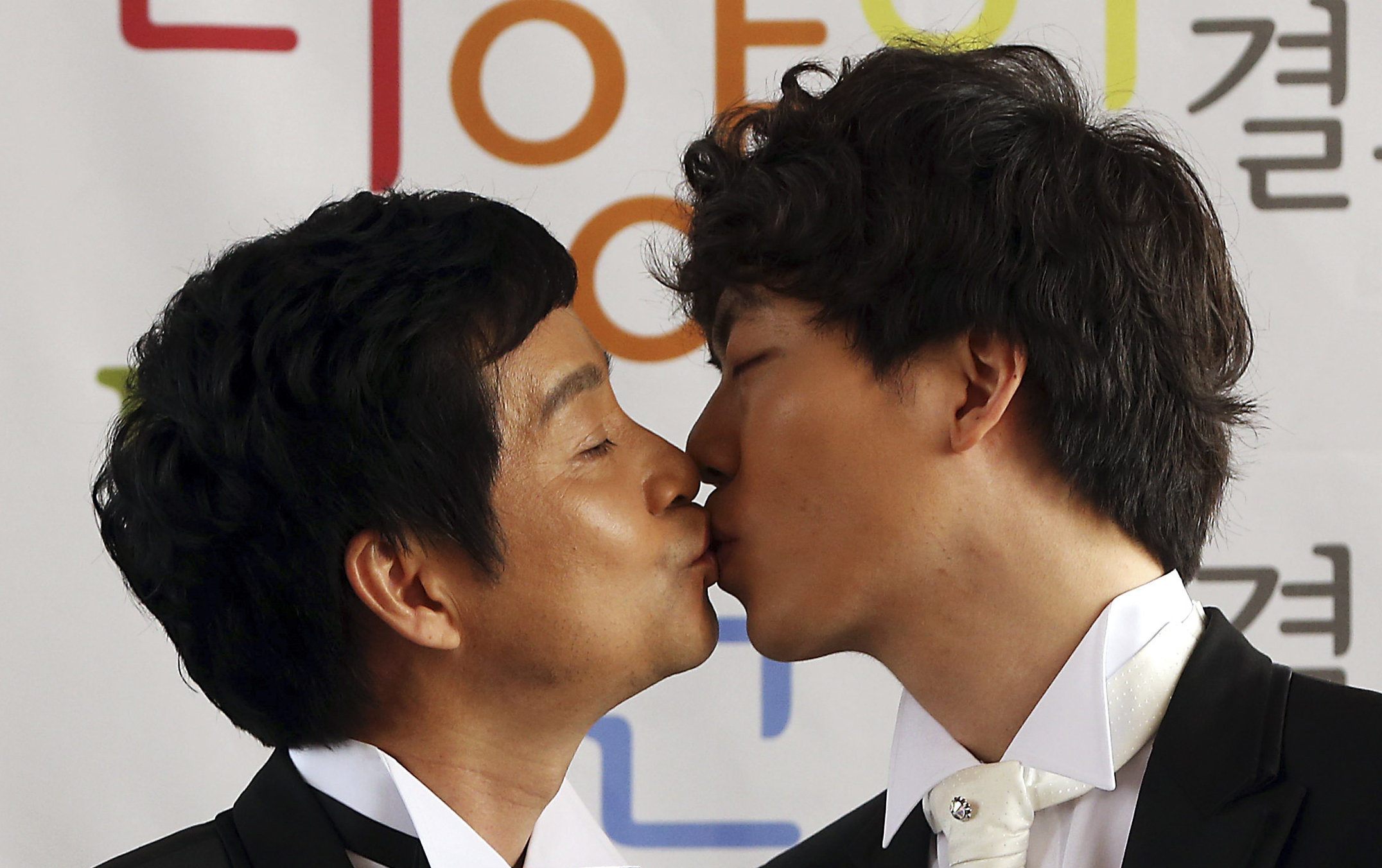 Korean movie director Kim Jho Gwangsoo, left, kisses with his partner Dave Kim during a news conference for their marriage in Seoul, South Korea. Kim Jho Gwangsoo finally accepted the fact he’s gay after a long period of painful self-torment some 20 years ago, he has decided to live a happy life that everyone recognizes to prove that being gay isn’t necessarily something unfortunate in South Korea where some people still associate homosexuality with disease. (Photo credit: AP photo by Yonhap, Yu Yong-suk)